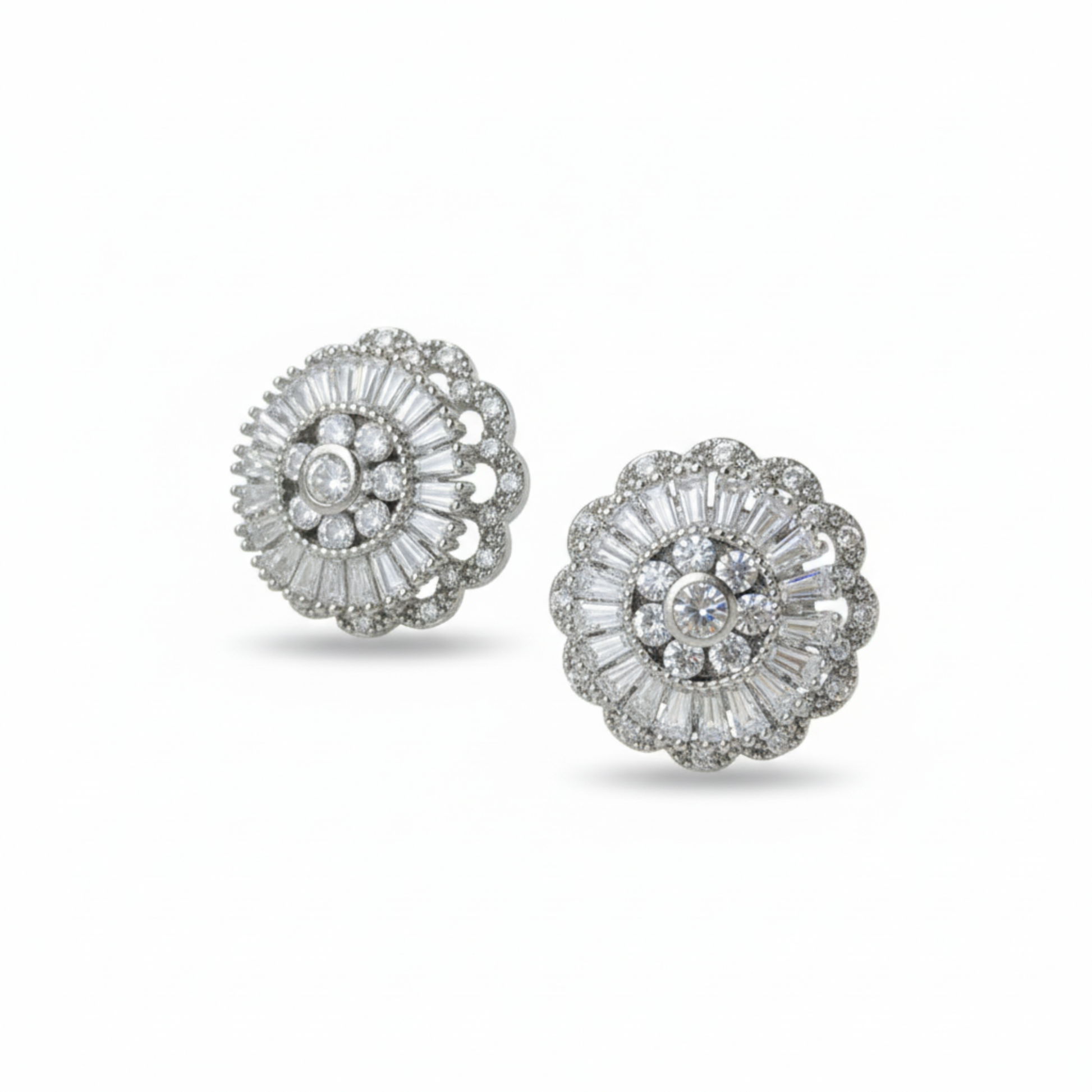 Aretes de acero en tono plateado con diseño giratorio en forma circular geométrica, adornados con circonias que aportan luz y dinamismo. Perfectos para un look minimalista pero llamativo.