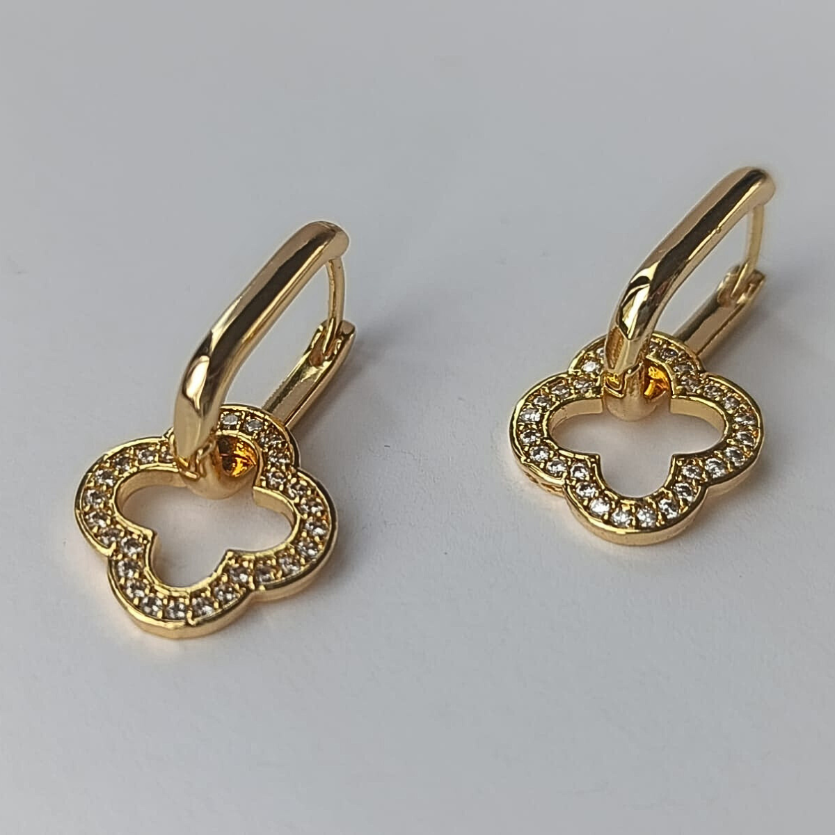 Aretes modernos en acero inoxidable dorado con dije de 4 pétalos varias barras incrustadas de circonias.