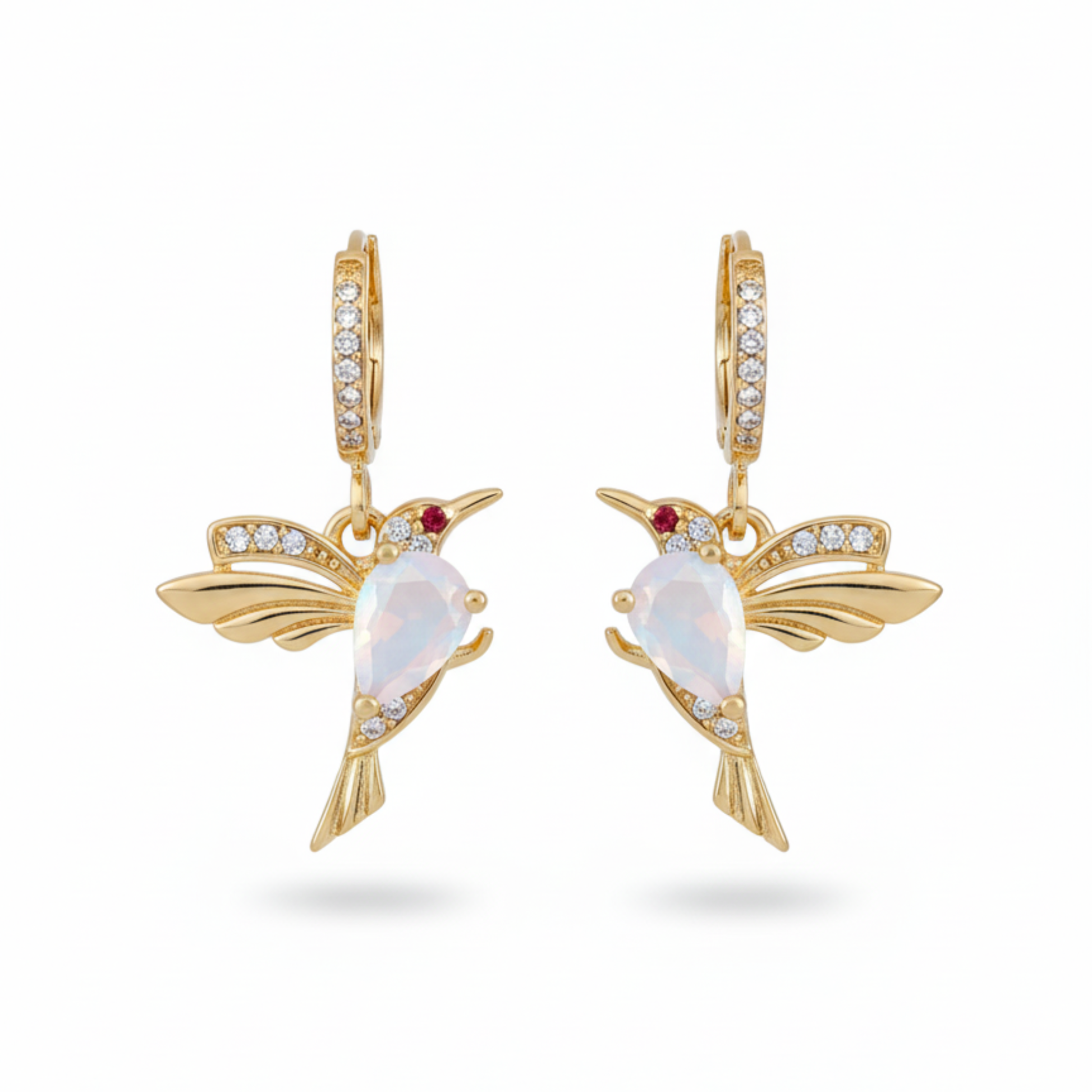 Arracadas chicas modernos en acero inoxidable dorado con dije de colibrí incrustadas de circonias.