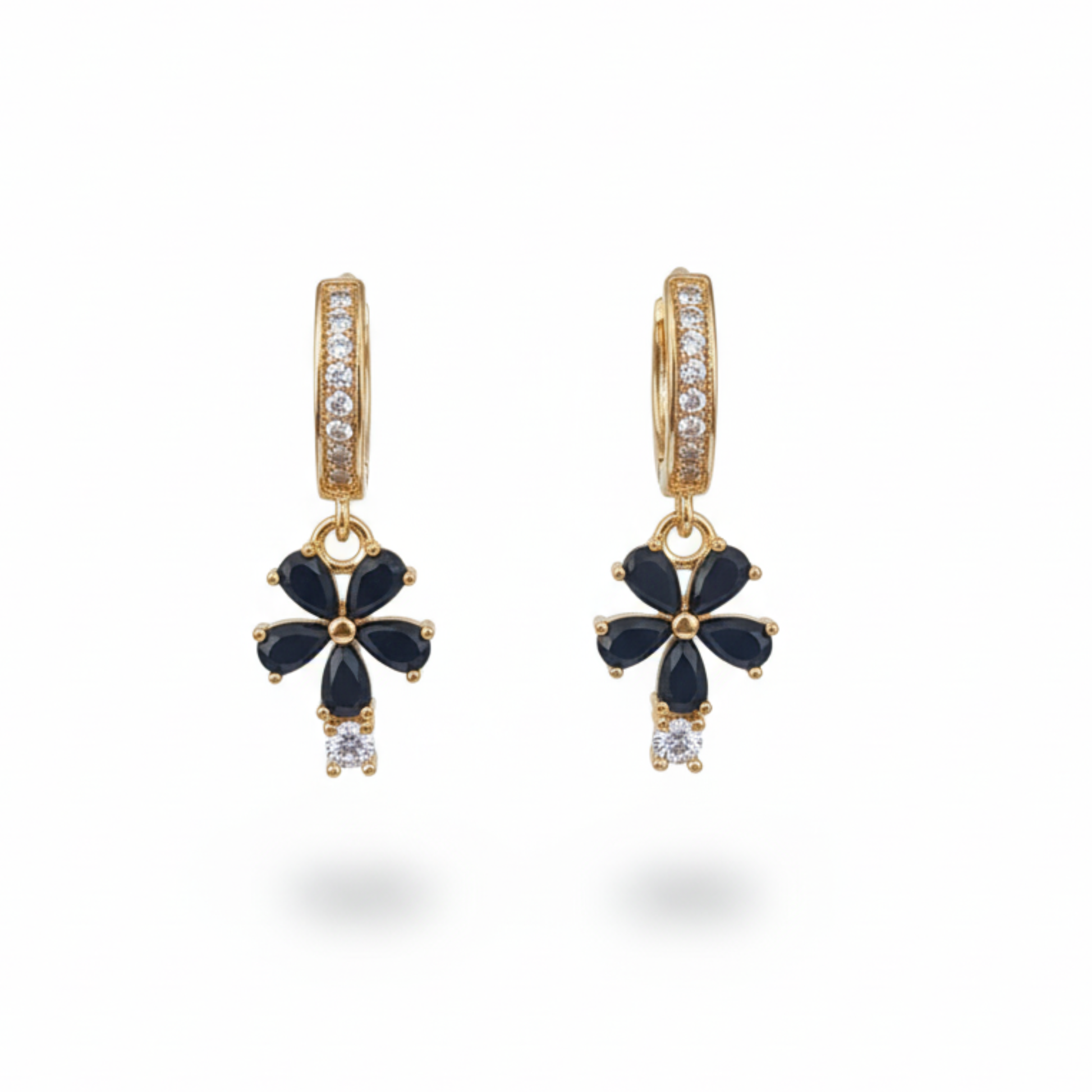 Arracadas Tipo Huggie con dije en forma de flor de Circonias en acero inoxidable dorado con circonias incrustadas.