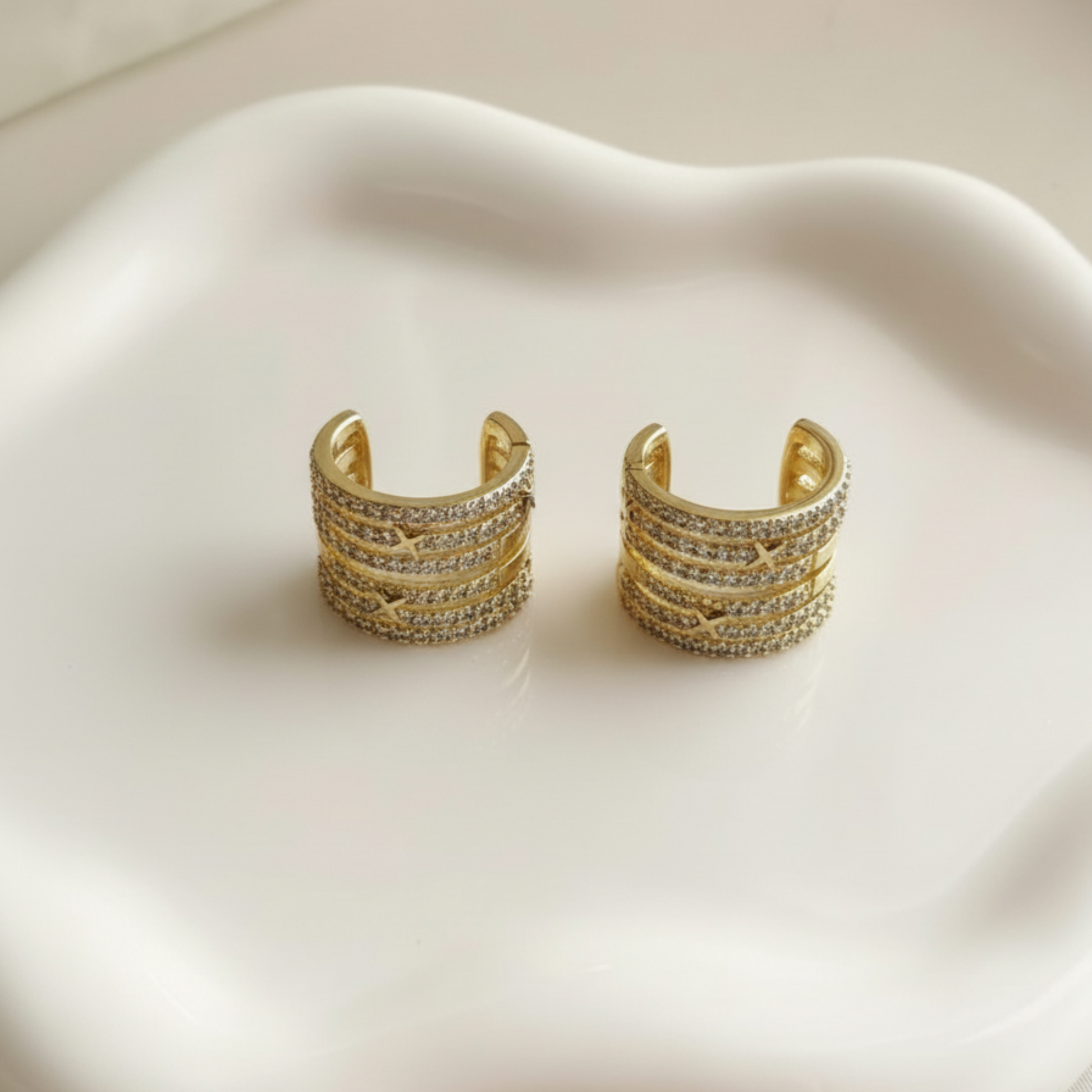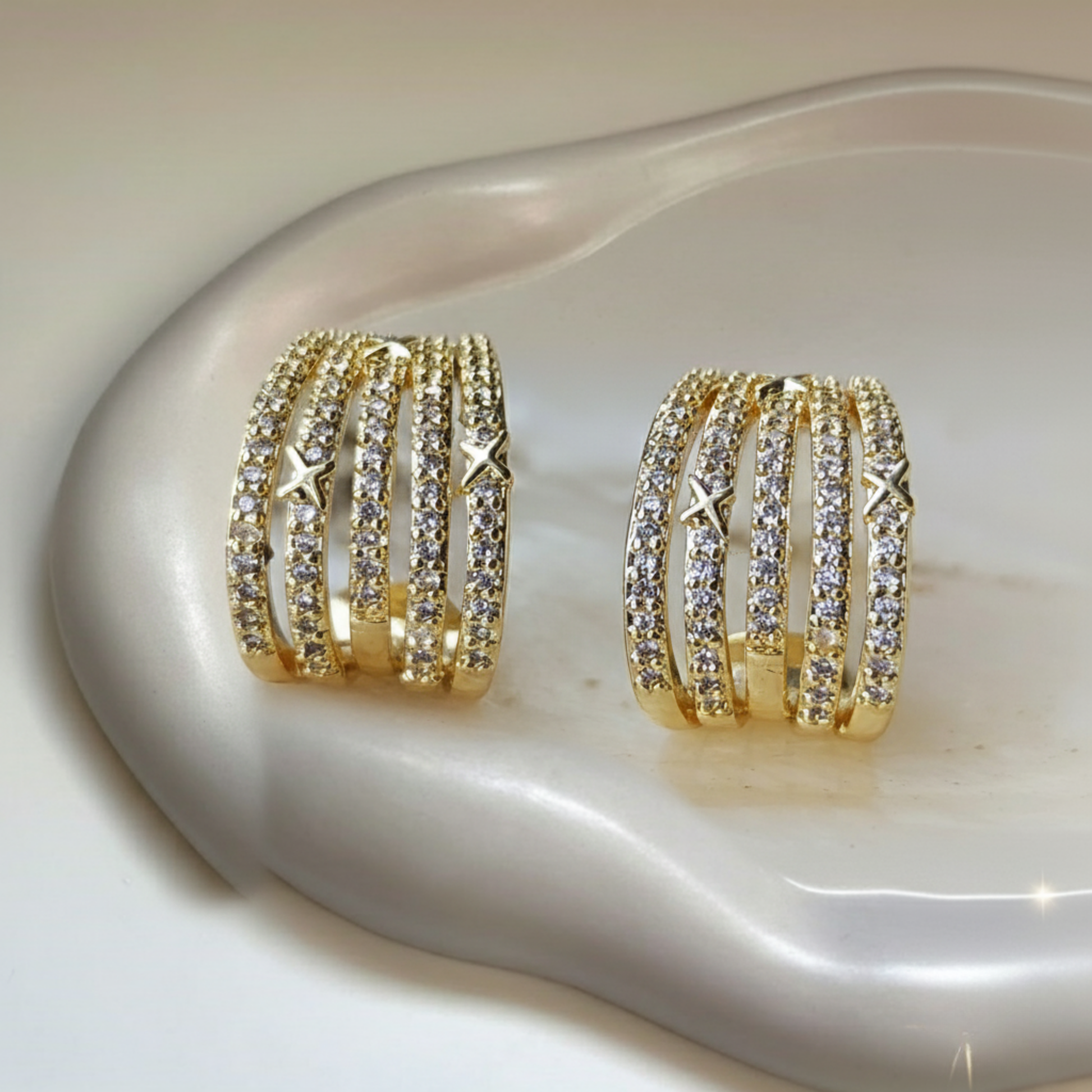 Aretes modernos en acero inoxidable dorado con varias barras incrustadas de circonias.