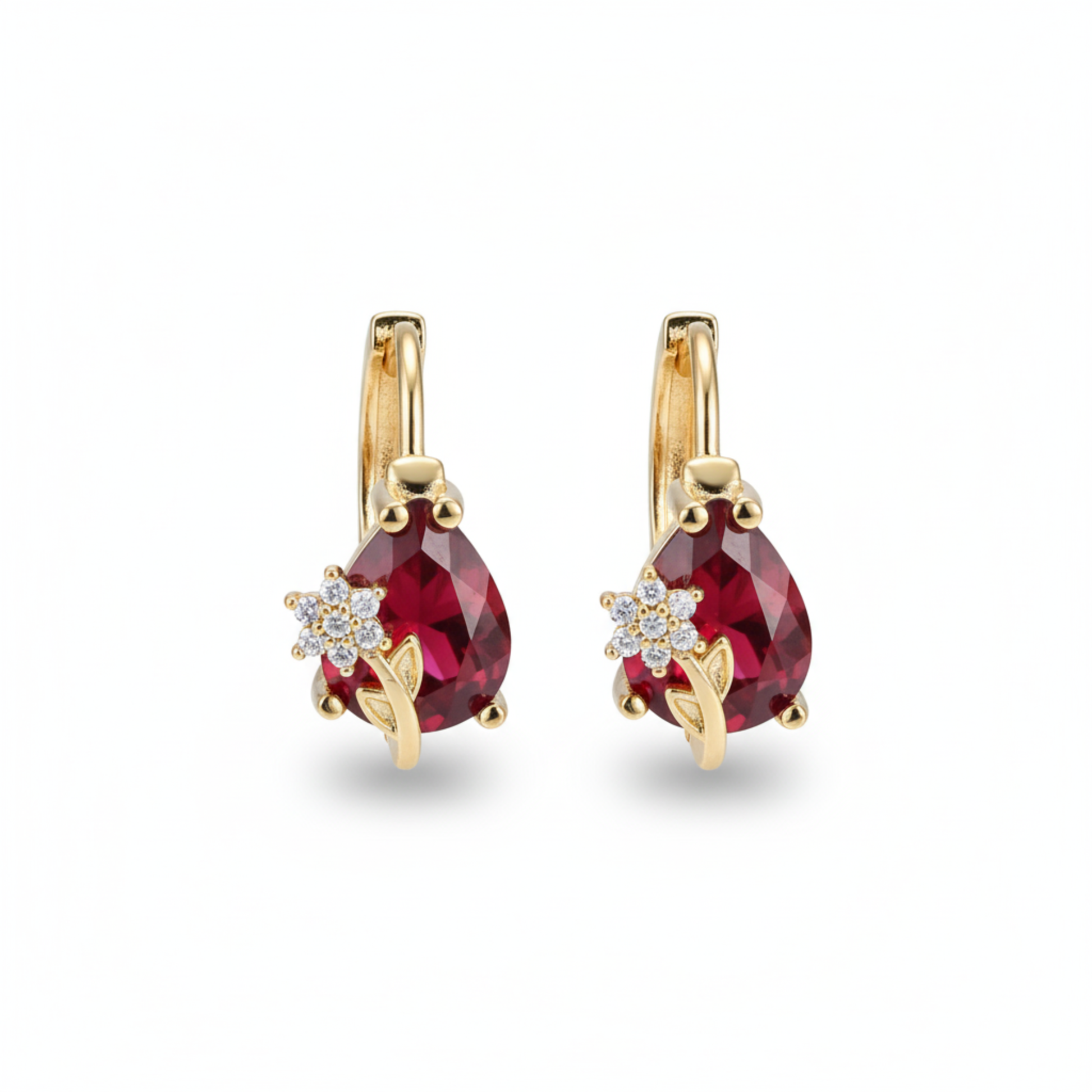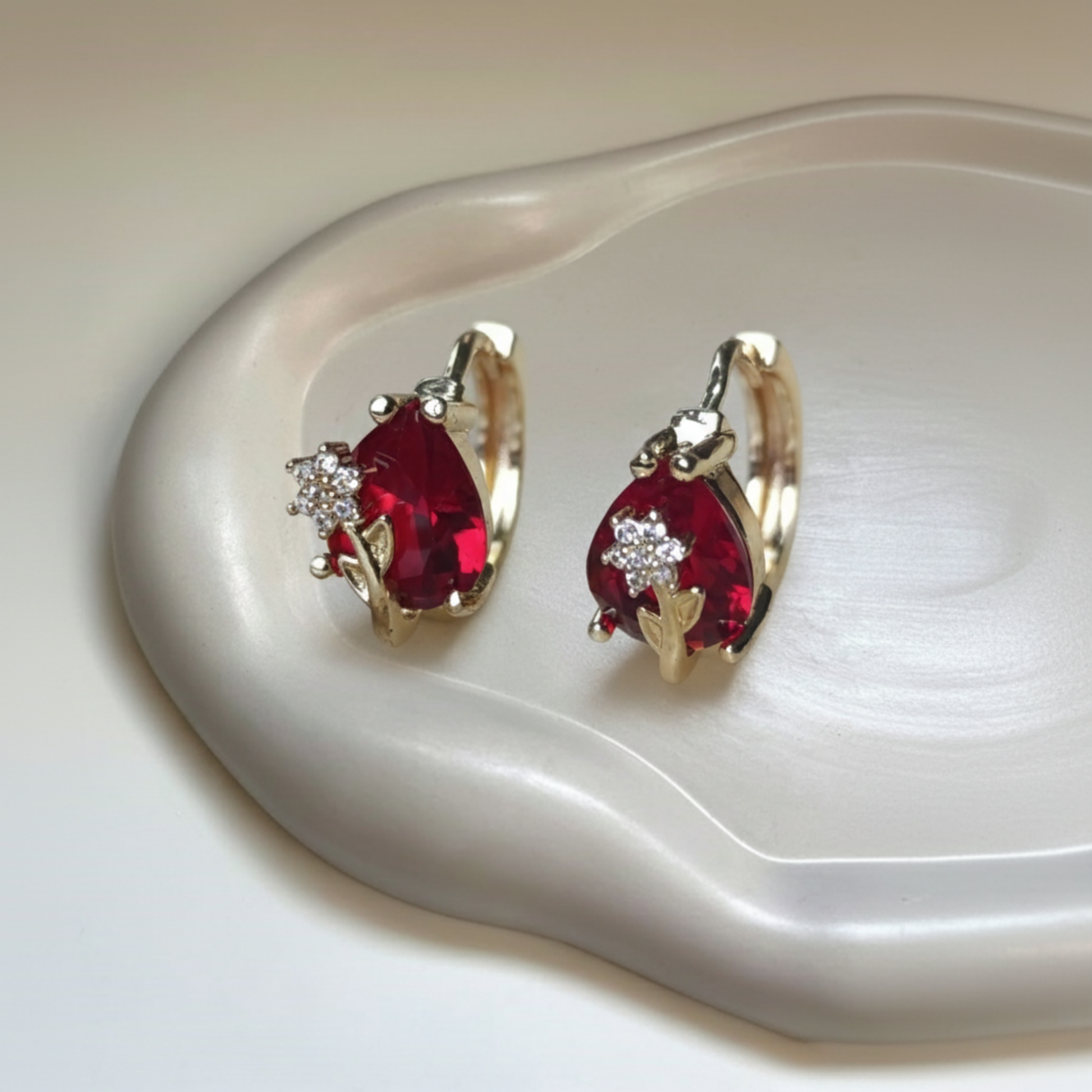 Arracadas Tipo Huggie Mini Gota de Circonias en color rojo, en acero inoxidable dorado y mini flor con circonia.