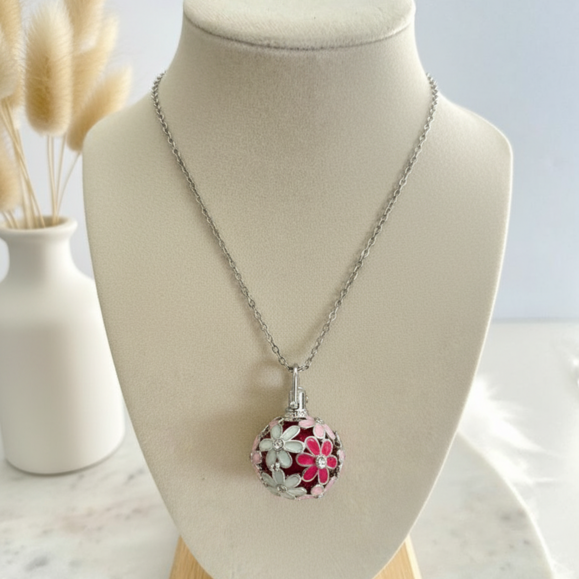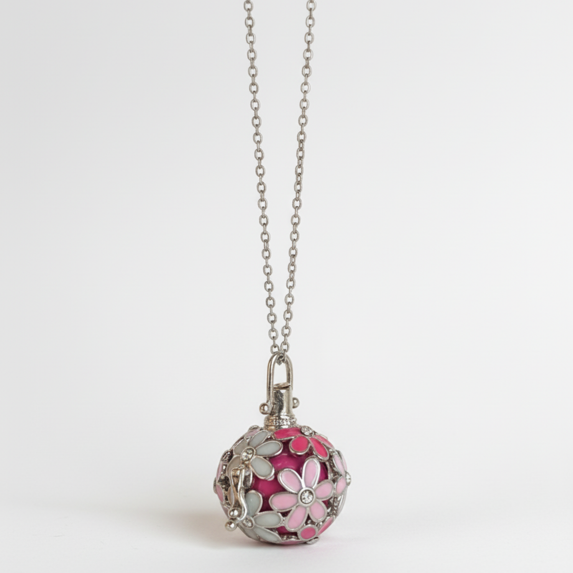 Collar de cadena plateada con dije esférico en tonos rosa y blanco.