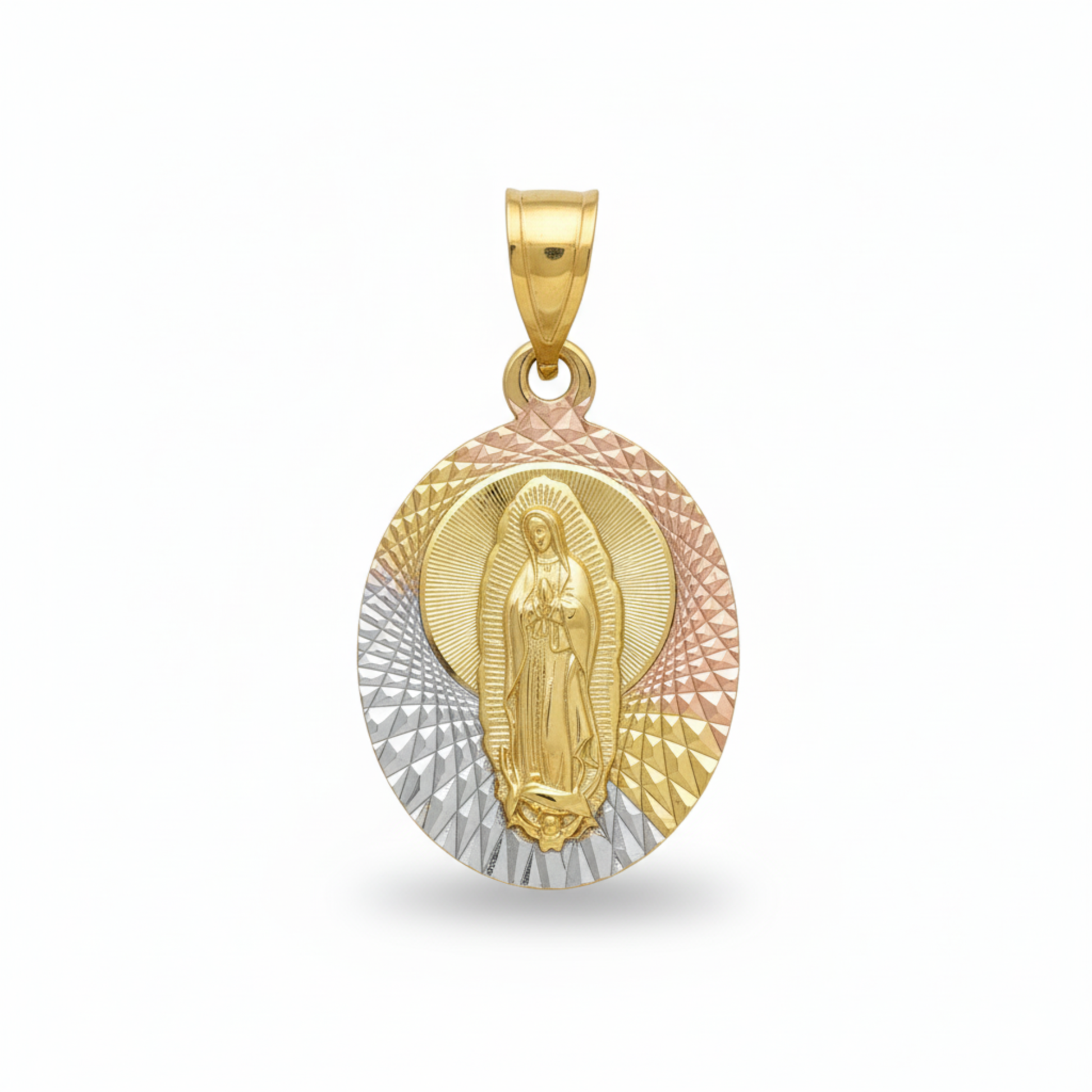 Un símbolo de fe y elegancia. Dije elaborado en acero inoxidable dorado con acabado brillante y detalles grabados de la Virgen de Guadalupe.